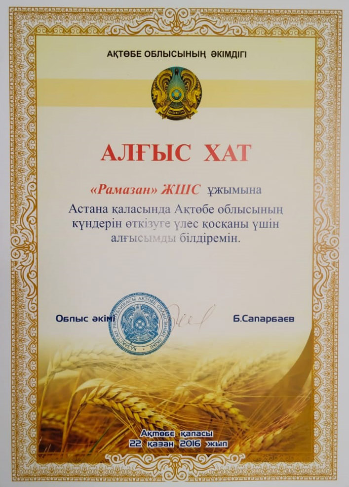 «Ramazan» KG Qozog‘istonning oziq-ovqat sanoatidagi tizim shakllantiruvchi korxonalaridan biri bo‘lib, unga quyidagilar kiradi: 10 000 ga ekin va yaylov yerlari, 1 500 ga sug‘oriladigan yerlar va 7 ta sug‘orish tizimi o‘rnatilgan, 2 ta don elevatori (bir vaqtda 80 ming tonna don saqlash quvvati), 2 ta un tegirmoni (kuniga 200 tonna un ishlab chiqarish quvvati), tuxum yo‘nalishidagi parranda fermasi (kuniga 450 ming dona tuxum quvvati), non zavodi (kuniga 70 tonna non maxsulotlari ishlab chiqarish quvvati), qandolat sexi (kuniga 6 tonna pechenye ishlab chiqarish quvvati), makaron sexi (kuniga 8 tonna ishlab chiqarish quvvati), ozuqa sexi (kuniga 90 tonna ozuqa ishlab chiqarish quvvati, shundan 55 tonnasi parranda fabrikasi o‘z ehtiyoji uchun), shuningdek «Ramazan» nomli oziq-ovqat do‘konlari tarmog‘i mavjud.